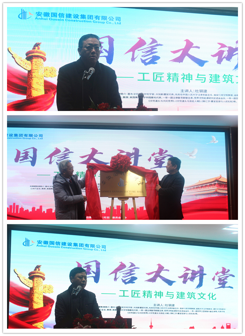 启动仪式上,集团党支部副书记、副总经理张官斌首先在讲话中强调要通过国信大讲堂平台,正面引导广大职工做到调预期、转观念、改作风,自觉讲政治,讲大局,讲正气,讲奉献,讲和谐,争当优秀和表率,确保各项事业持续健康发展。随后,集团党支部书记、董事长周先玉和杜钢建教授共同为“国信大讲堂”揭牌。合肥市包河区工商联副主席宋兴春在致辞中表示,国信大讲堂的开设开讲,是国信集团在新时代立足新发展阶段、贯彻新发展理念、构建新发展格局,锐意进取、追求卓越的一种责任担当,是创新学习教育、建设人才梯队的一大重要创举,更是企业文化的又一传承创新。希望大讲堂持续举办下去,做到统筹兼顾,成为企业的学习品牌;在内容安排上做到丰富多样,坚持正确政治方向、坚持贴近企业发展实际、坚持服务企业发展和人才队伍建设;要注重效果,可以尝试请技术能人、项目经理、管理人员等企业自己人走上大讲堂,用身边人讲身边事或许会有不一样的学习教育效果。