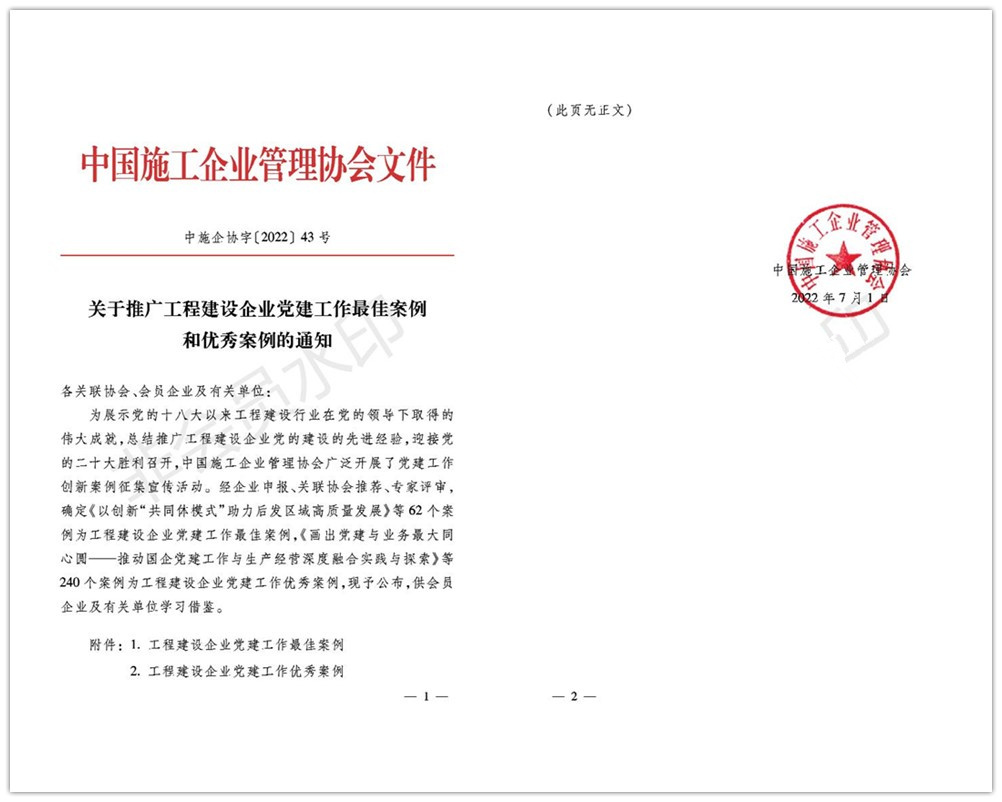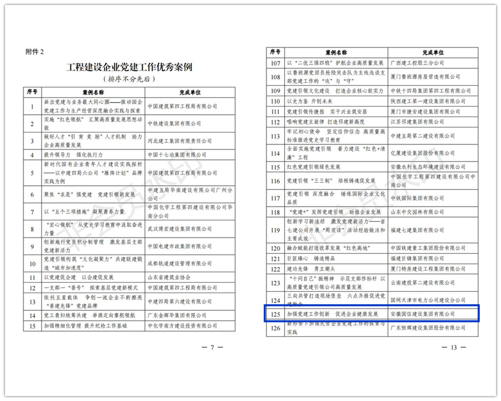 为展示党的十八大以来工程建设行业在党的领导下取得的伟大成就,总结推广工程建设企业党的建设的先进经验,迎接党的二十大胜利召开,中国施工企业管理协会广泛开展了党建工作创新案例征集宣传活动。7月1日,经企业申报、关联协会推荐、专家评审,由国信集团编制申报的《加强党建工作创新,促进企业健康发展》案例被中国施工企业管理协会评为工程建设企业党建工作优秀案例。
