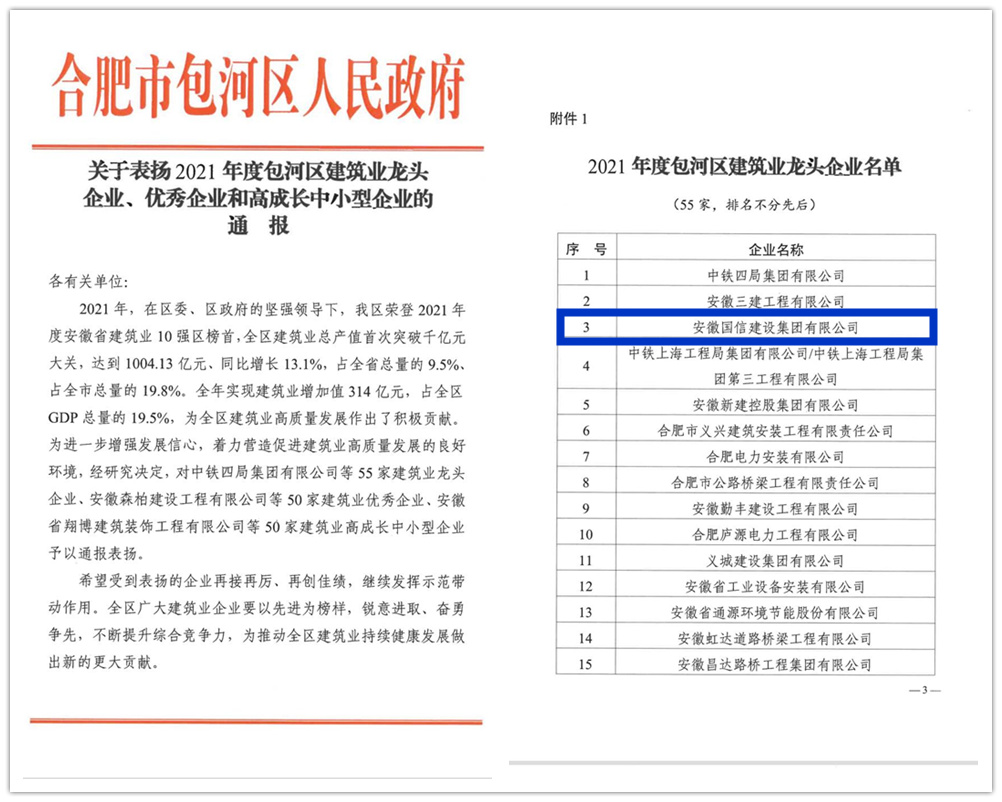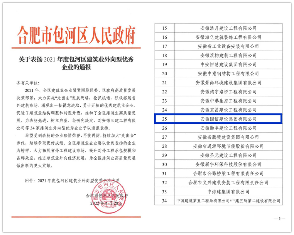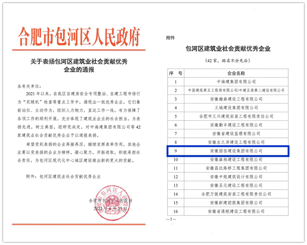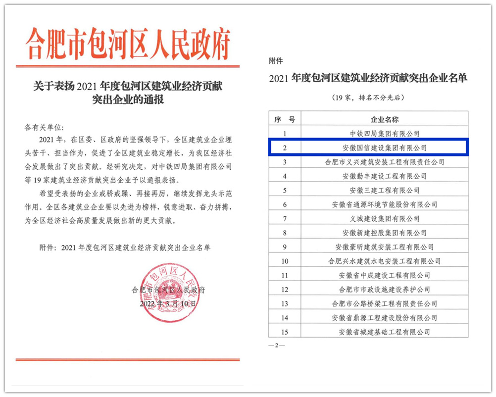 2021年度,面对错综复杂的宏观形势和经济下行的巨大压力,国信集团坚定信心,迎难而上,坚持苦干实干、大胆创新,用实际行动为包河区的经济发展做出了突出贡献,在大批企业中脱颖而出。近日,为表彰先进,树立典型,合肥市包河区人民政府对相关企业进行了通报表彰,国信集团荣获“包河区建筑业龙头企业”“包河区建筑业经济贡献突出企业”“包河区建筑业社会贡献优秀企业”“包河区建筑业外向型优秀企业”等多项表彰。
