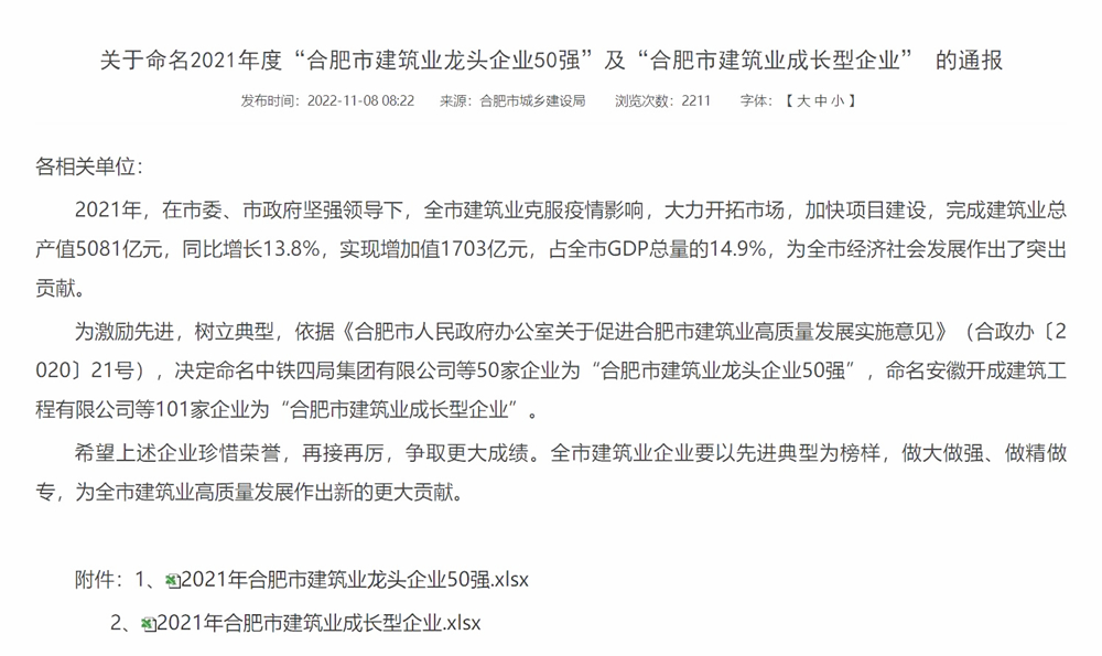 “合肥市建筑业龙头企业50强”依据《合肥市人民政府办公室关于促进合肥市建筑业高质量发展实施意见》(合政办〔2020〕21号)命名,旨在激励先进,树立典型,鼓励建筑业企业为合肥市建筑业高质量发展作出新的更大贡献。