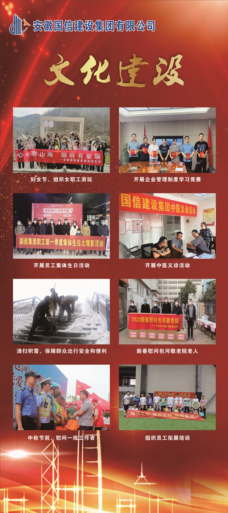 2022年,是党的二十大召开之年,是实施“十四五”规划、全面建设社会主义现代化国家的重要一年,更是国信集团继续稳健前行的又一年。我们认真学习贯彻党的二十大和中央经济工作会议精神,把学习成果转化为推动企业高质量发展的坚实力量,不断增强企业的凝聚力、向心力,奋力打赢疫情防控阻击战、“经济总量突破、发展质量突破”攻坚战、改革创新优化升级阵地战,用坚守和坚韧谱写了践行初心、不辱使命的新篇章。这一年,质量安全形势平稳、工程创优捷报频传;管理提升循序渐进、科技创新步伐加快:市场领域不断拓展、重点工程优质履约;优化升级彰显实力、竞争优势持续增强;文化建设硕果累累,品牌声誉不断提升;从容应对风险挑战、企业发展稳中求进;勇于承担社会责任,努力实现共同富裕。