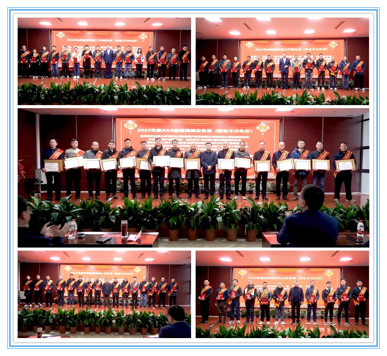 随后,集团副总经理张官斌宣读了《关于表彰2022年度AAA级信用单位和先进个人的决定》,对16个“2022年度AAA级信用单位”、29名“2022年度先进工作者”、15名“优秀质量管理人员”、11名“优秀项目安全员”进行表彰,周先玉、何学松、邓红兵、李炳胜等集团领导为获奖集体和个人颁发奖牌和证书。