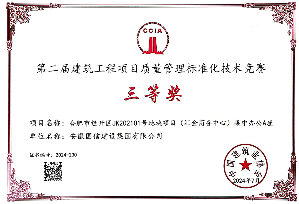 合肥市经开区JK202101号地块项目(汇金商务中心)位于合肥市经开区,总建筑面积约 20.2 万平米。建设内容为新建南侧集中办公(A 座办公楼)、北侧集中办公(B、C 座办公楼)、商务办公(B1-B9)、商业及相关配套服务设施等工程(包括幼儿园)。自开工建设以来,项目部根据不同施工阶段、不同作业内容要求,从“精细化管理”到“落实细节整改”进而实现“质量创优双收”,对前期策划、质量管理、安全把控等各个方面进行全过程标准化管控,持续提升工程质量水平,力求打造精品工程。下一步,国信集团将以此获奖为契机,进一步深化工程质量创新,持续夯实基础管理工作,提升质量管理水平,争创更多更好的精品工程、优质工程,为擦亮企业品牌添砖加瓦。