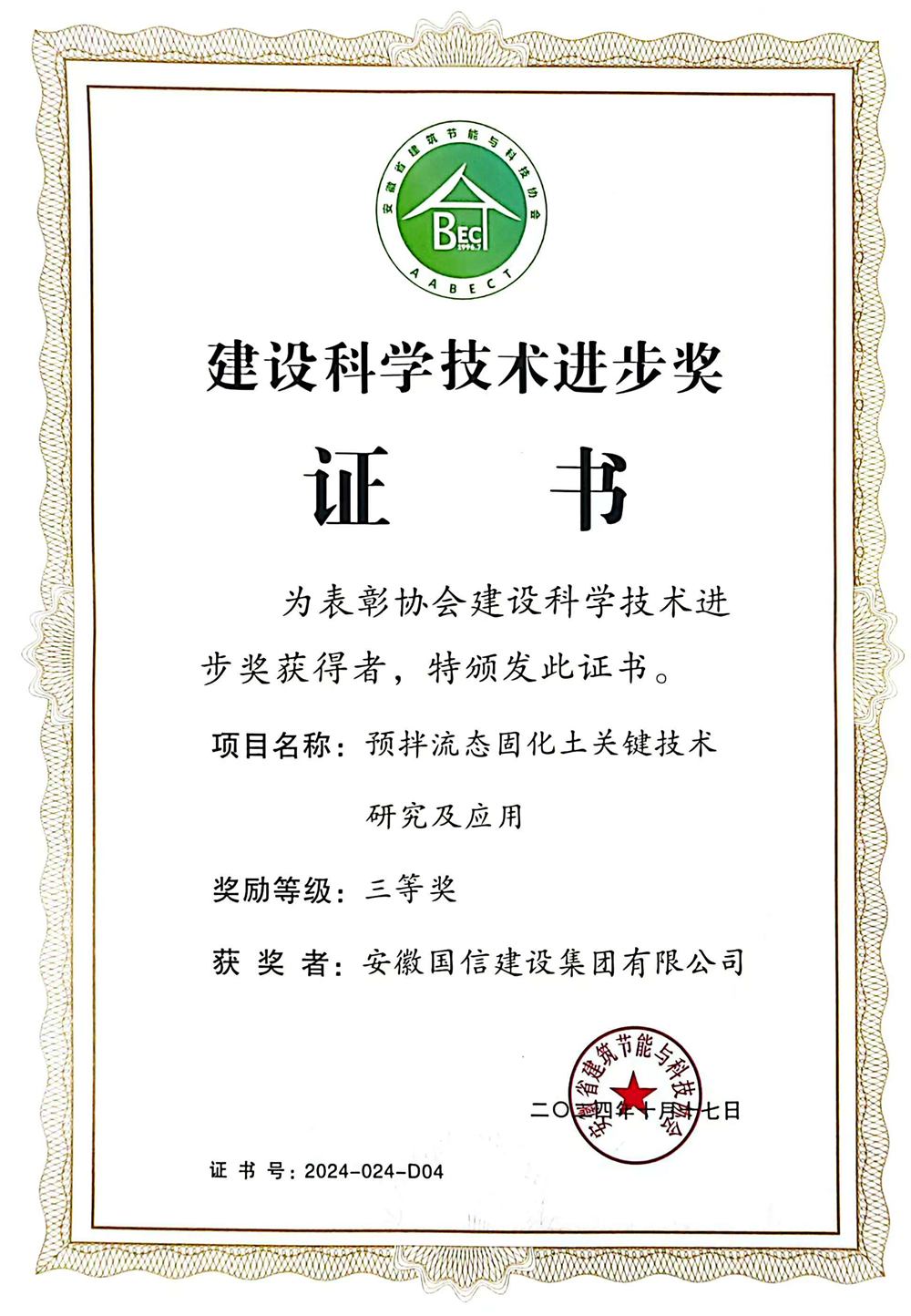 此外,近日从安徽省建筑节能与科技协会传来喜讯,由国信集团申报的《预拌流态固化土关键技术研究及应用》荣获安徽省建设科学技术进步奖三等奖。安徽省建设科学技术进步奖由安徽省建筑节能与科技协会组织评选,主要围绕项目创新性、经济与社会效益、推广应用价值等进行综合评价,代表安徽省建设科学科技创新的最高成就。国信集团将持续深入学习贯彻党的二十大精神,坚持创新驱动发展,依托省级企业技术中心平台,不断加大科技创新投入,建设专业人才队伍,深入开展各业务领域技术研发和推广应用,提升企业核心竞争力,助力企业高质量发展。