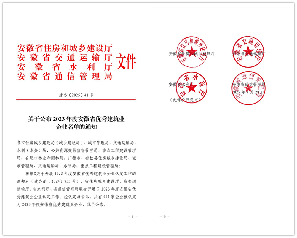 4月28日,安徽省住房和城乡建设厅、安徽省交通运输厅、安徽省水利厅、安徽省通信管理局联合公布了“2023年度安徽省优秀建筑业企业”名单,国信建设集团在众多参评的企业中再次脱颖而出,蝉联“安徽省优秀建筑业企业(综合基础设施总承包类)”殊荣。自开展安徽省优秀建筑业企业认定以来,国信集团连续四年荣登榜单,充分体现了其在建造能力、经营发展、管理创新、文化建设、社会责任履行等方面的卓越表现和行业认可。