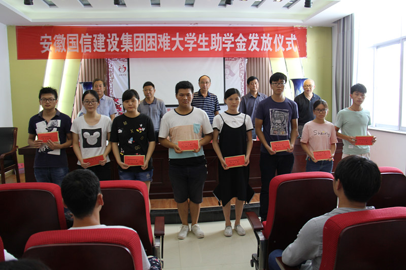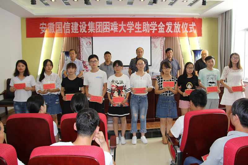 捐赠仪式由刘煜会长主持。首先,国信集团向40名受助学生、8户特困各发放助学金和救助金共20.8万元。安徽师范大学学生储鹏燕作为受助学生代表上台发言,她汇报了两年多来在校生活和学习情况,由衷地感谢国信集团对岳西贫困大学生的关心和帮助,得以让她们走出困境,圆了大学梦,缓解了家庭经济困难和压力。她表示要珍惜来之不易的学习机会,努力奋斗,刻苦拼搏、绝不辜负国信集团的关爱和希望,用自己的青春和激情回馈社会。