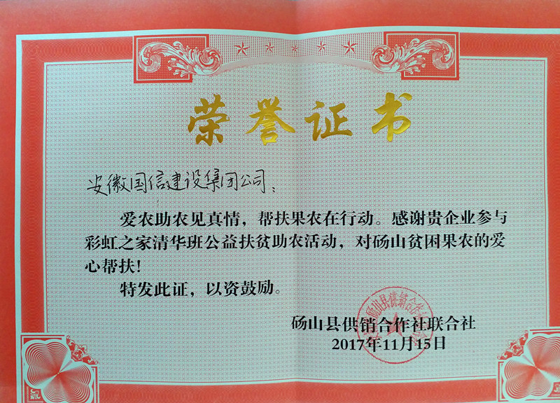 为感谢国信集团的助农义举,砀山县供销合作社联合社专程送来荣誉证书。
