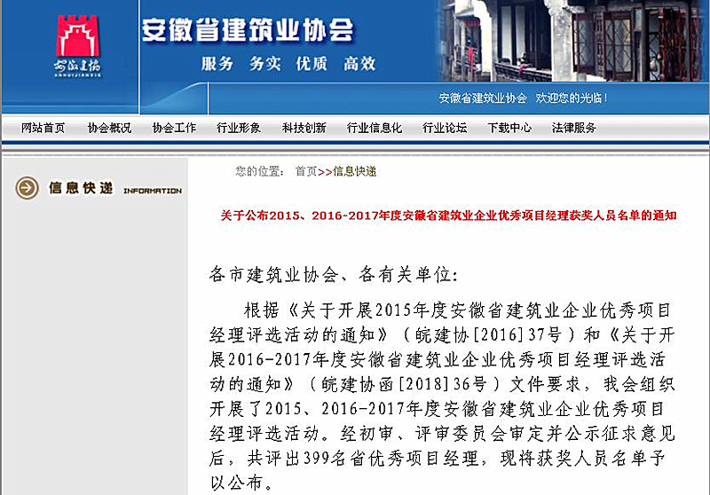4月9日,安徽省建筑业协会公布了2015、2016-2017年度安徽省建筑业企业优秀项目经理获奖人员名单,国信6人获此殊荣,魏玉党、束巧玲、梅发松、朱国云、王祥卓、马家军荣为2016-2017年度安徽省建筑业企业优秀项目经理。