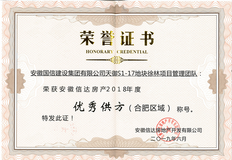 该荣誉是安徽信达房产对国信集团的充分肯定和认可,国信人将不负厚望,继续秉持“诚信履约、品质至上”的施工理念,不断攻坚克难,与信达地产在更深更广的领域实现合作共赢。
