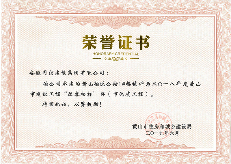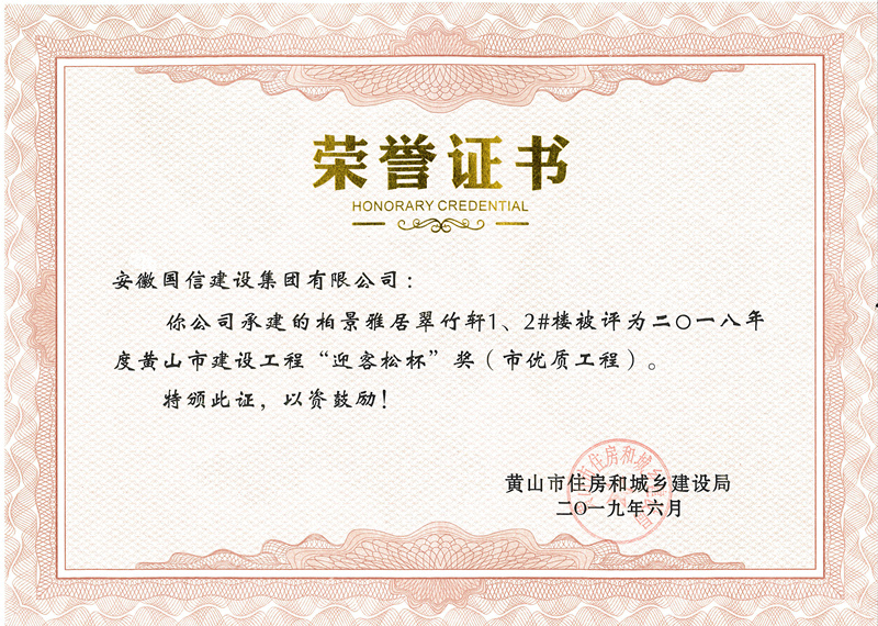 近日,从黄山市住建局传来喜讯,由国信建设集团承建的栢悦公馆1#楼以及栢景雅居翠竹轩1、2#楼荣获2018年度黄山市建设工程“迎客松杯”奖(市优质工程)。