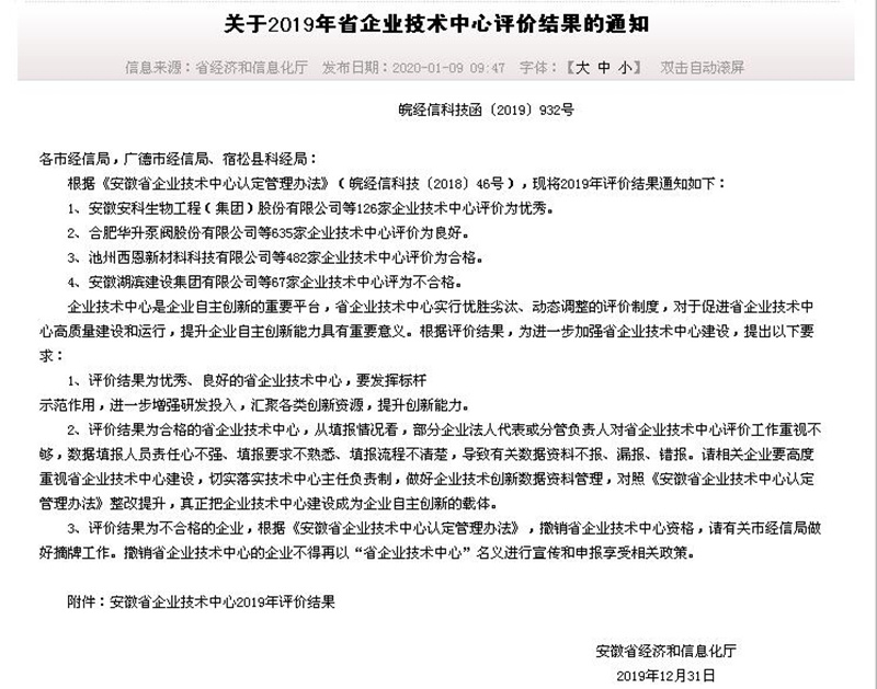 1月9日,安徽省经济和信息化厅下发了《关于2019年省企业技术中心评价结果的通知》。根据《安徽省企业技术中心认定管理办法》(皖经信科技〔2018〕46号)相关规定,国信集团技术中心获评良好,将发挥标杆示范作用,进一步增强研发投入,汇聚各类创新资源,提升创新能力。