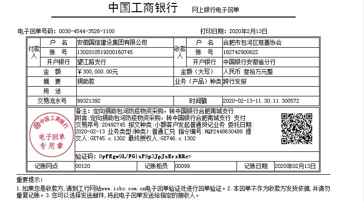 众志成城,共抗疫情。为积极履行防控责任,保护人民群众生命安全和身体健康,2月13日,国信建设集团通过合肥市包河区慈善协会捐款30万元,定向用于包河区防疫物资采购,助力包河区抗击新型冠状病毒肺炎疫情。这是国信集团自前期向阜南地区捐赠总价4万元防护口罩后的又一次善举。