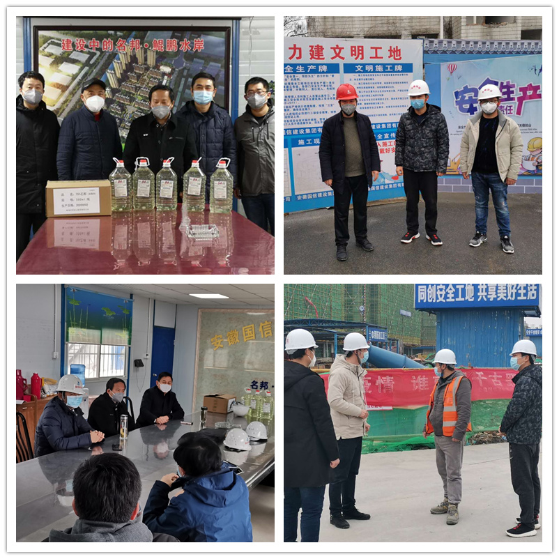 防疫情,保生产。2月27日,国信建设集团董事长周先玉、总经理何学松等领导分别带队赴无为碧桂园·翡翠印象和六安高皇东村等项目检查指导疫情防控和复工生产工作,现场协调解决存在的困难和问题。各队人员还给项目部送去了75%酒精、84消毒液等防疫物资,亲切慰问了一线职工。