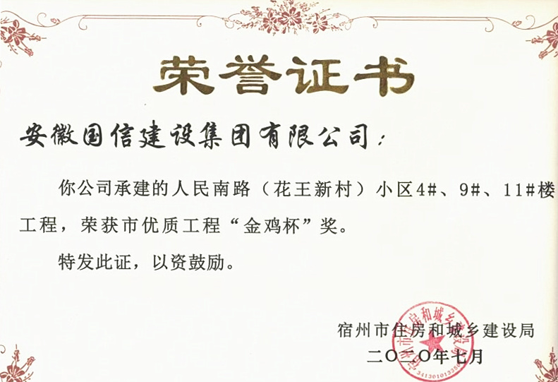 近日,从宿州市住房和城乡建设局传来喜讯,由国信建设集团承建的花王新村小区4#、9#、11#楼工程荣获宿州市优质工程“金鸡杯”奖,这是继该项目获得“宿州市建筑施工安全生产标准化示范工地”后的又一荣誉。