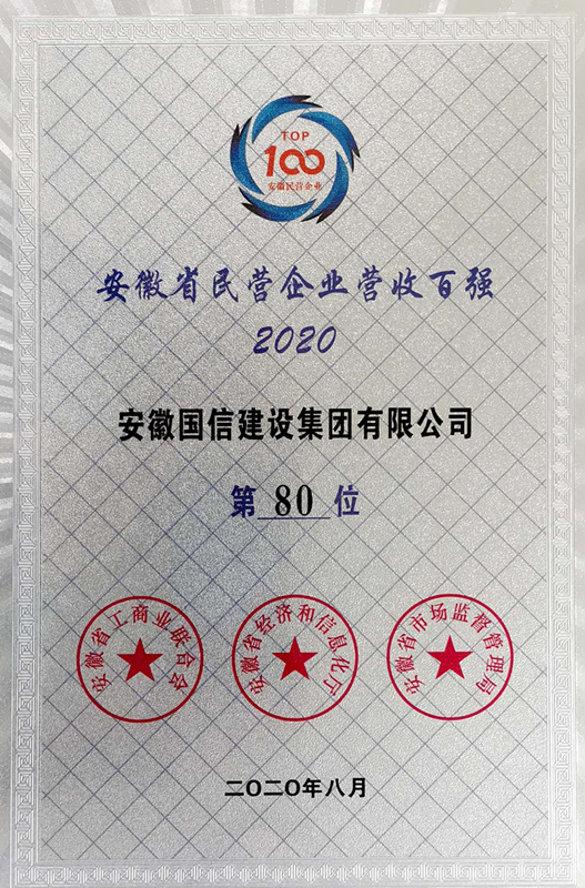 作为民营经济发展的晴雨表和风向标,安徽省上规模民营企业经营情况调研及百强排序活动迄今已连续开展了22年,国信集团连年荣列安徽省民营企业百强榜单。2019年,面对复杂多变的国内外经济环境,国信集团通过理念创新、管理创新、制度创新等举措,在结构调整、转型发展以及市场开拓中都取得更大进步。先后荣获全国建筑业AAA级信用企业、全国工程建设诚信典型企业、安徽省百强企业等多项荣誉。在企业运营状况总体向好的同时,国信集团还积极履行社会责任,对促进安徽经济和社会发展发挥了积极作用。