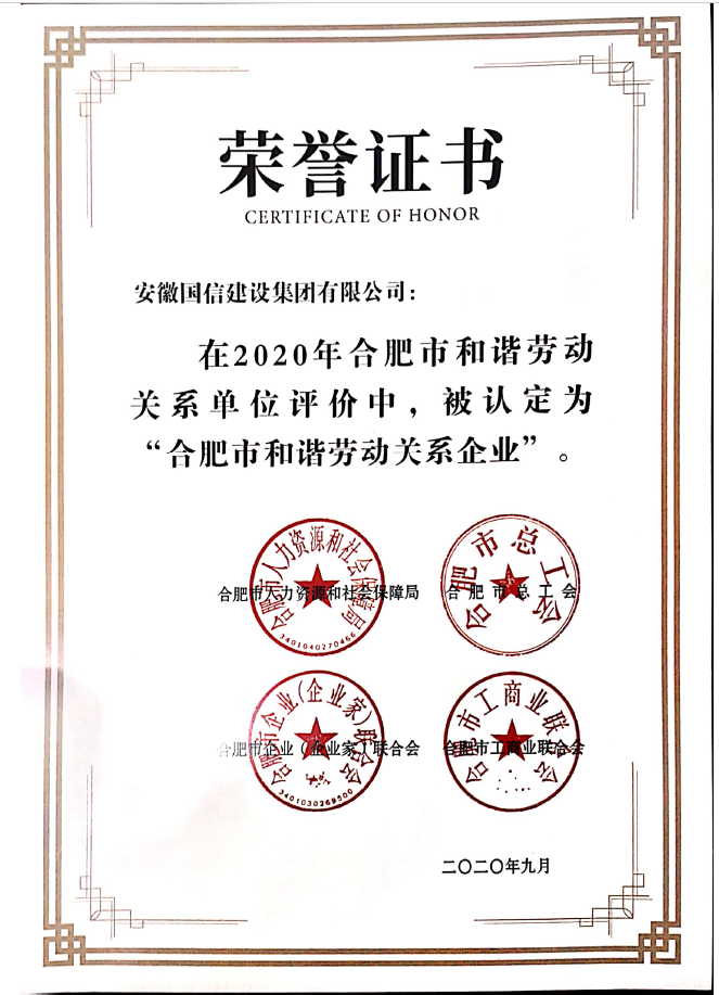 近日,在合肥市人力资源和社会保障局、合肥市总工会、合肥市企业(企业家)联合会、合肥市工商业联合会联合开展的2020年合肥市和谐劳动关系单位评价活动中,国信集团荣获“合肥市和谐劳动关系企业”称号。